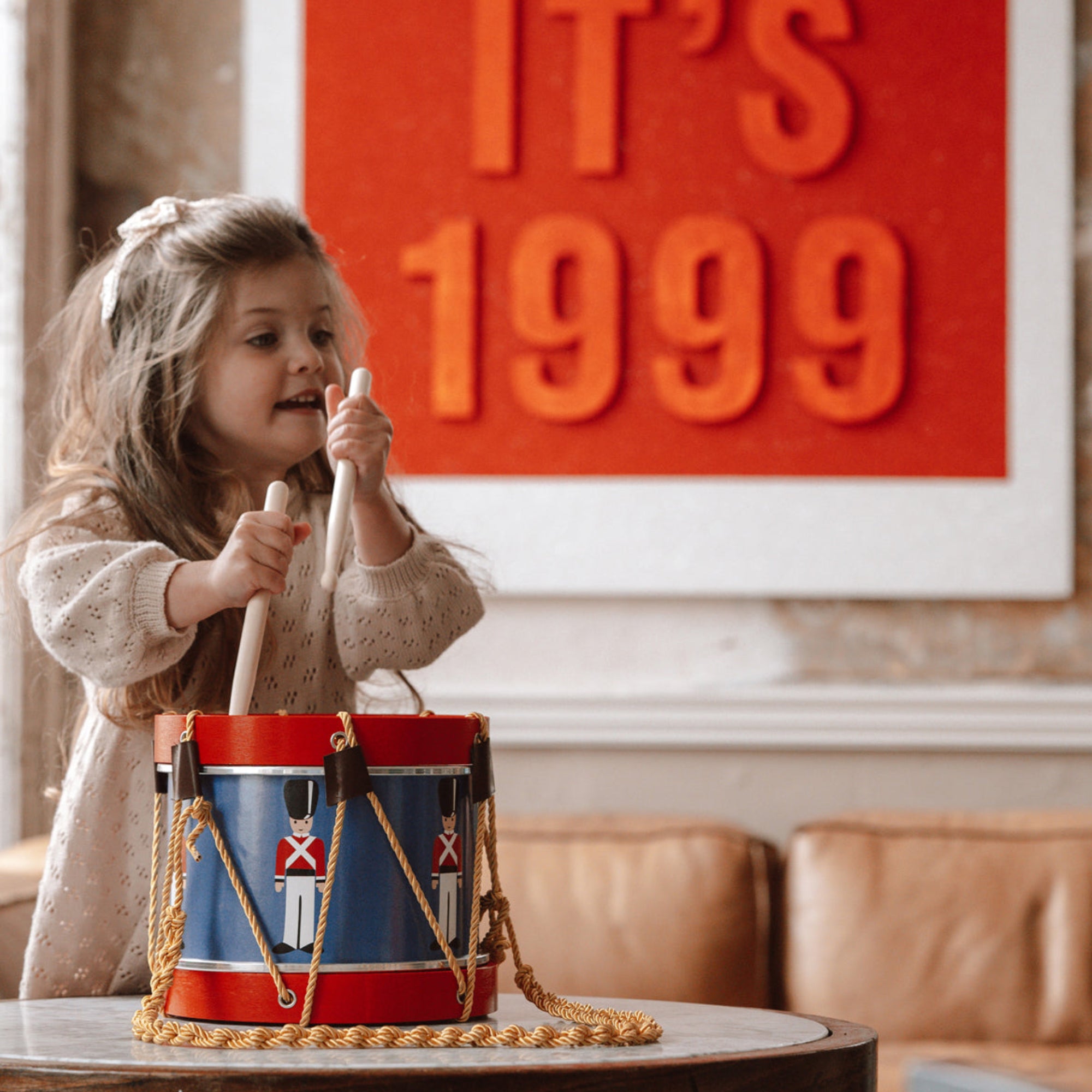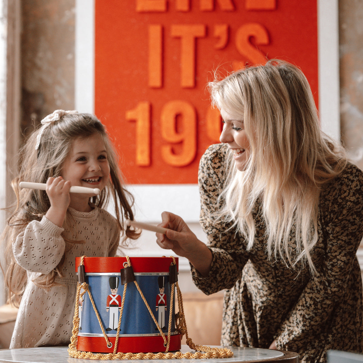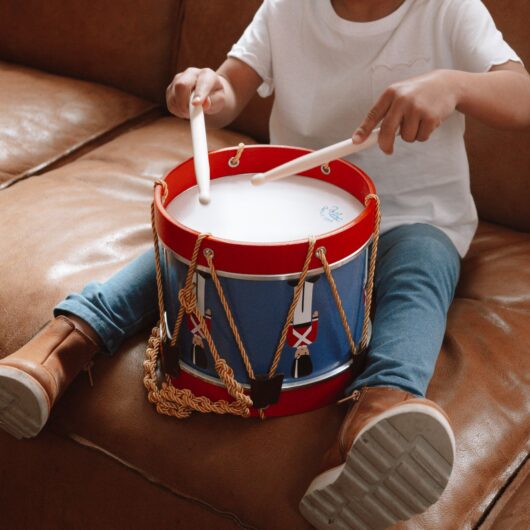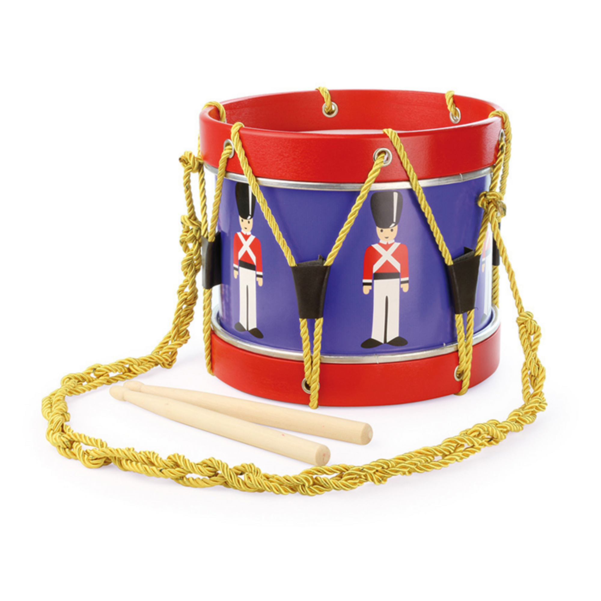 Mali metalni bubanj lako postaje prvi ritam koji dijete nosi sa sobom. Lagano visi preko ramena, uvijek spreman za male parade, sitne korake i prve muzičke pokušaje. Drveni štapići lijepo leže u rukama, a zvuk koji nastaje je jednostavan, čist i dovoljno nježan za početnike. Igra koja razvija ritam, koordinaciju i osjećaj vlastitog izraza.