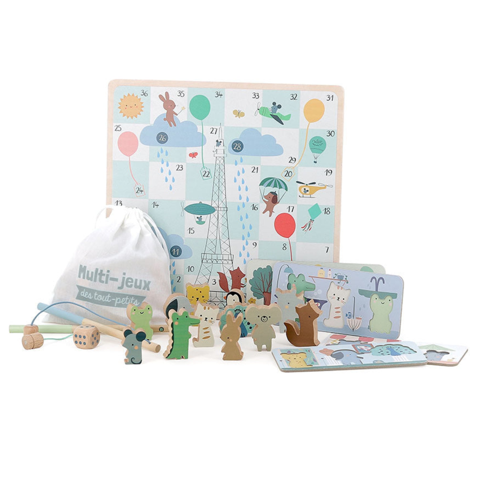 Four first board games gathered in one wooden box — simple, gentle, and perfect for small hands. Geese, ladders, fishing, and bingo become little rituals of togetherness, moments where a child learns to count, take turns, and follow the flow of play, all without pressure or hurry.